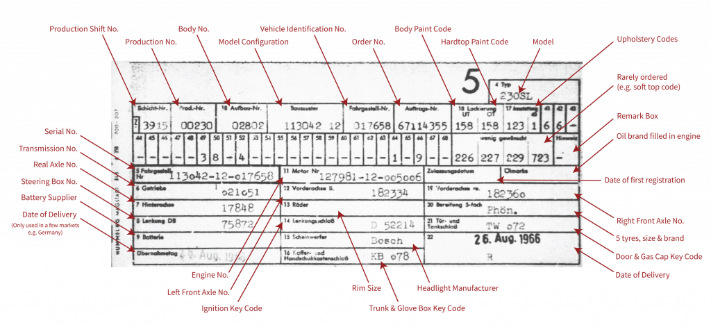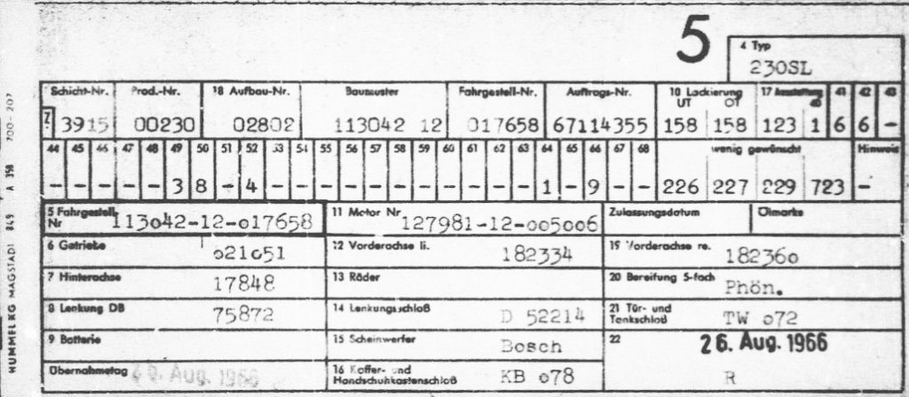 There are four types of data cards for the W113 cars that all read differently. The information varies slightly depending on the year of the car, however it gives information such as the paint and upholstery codes, transmission and axle numbers, and dates etc.